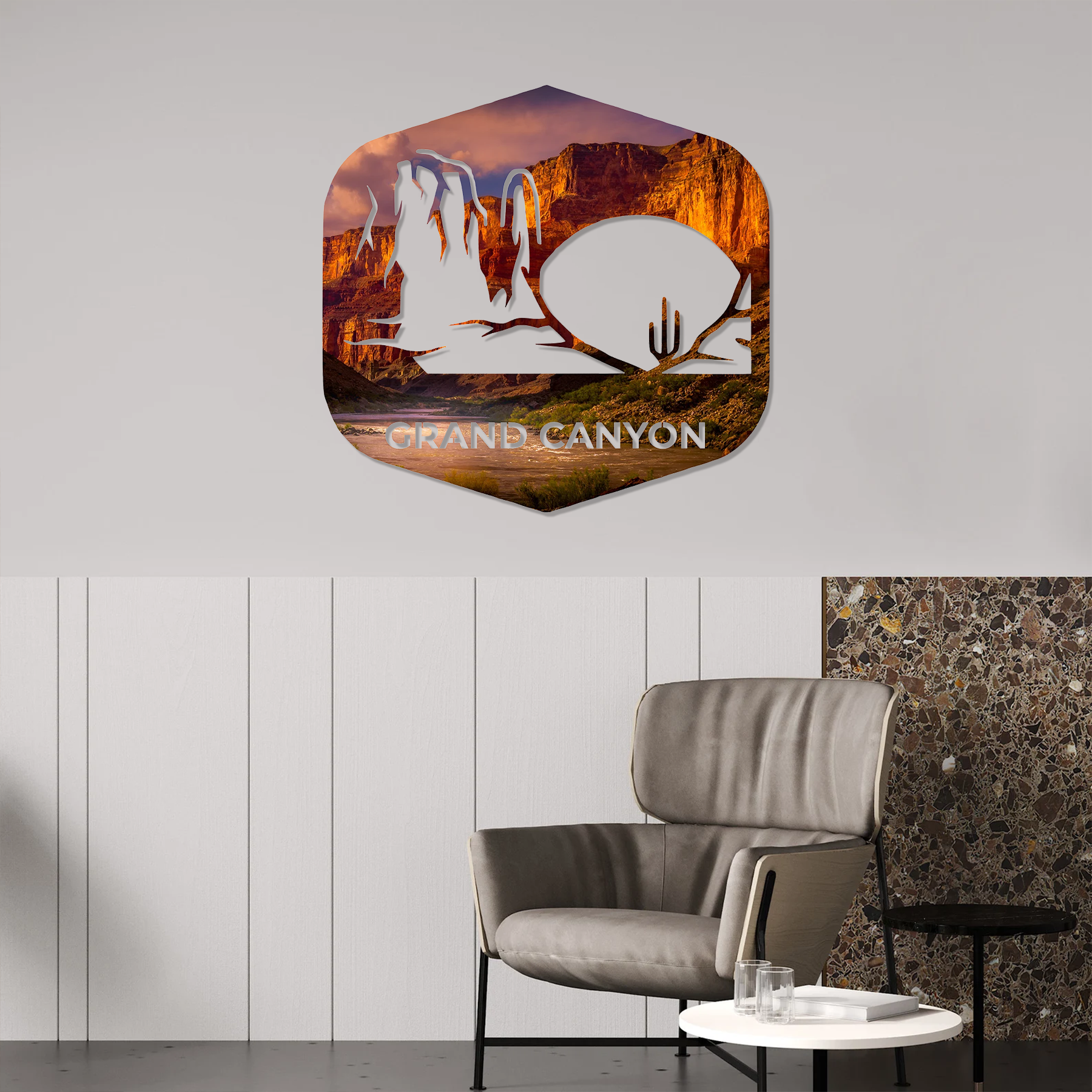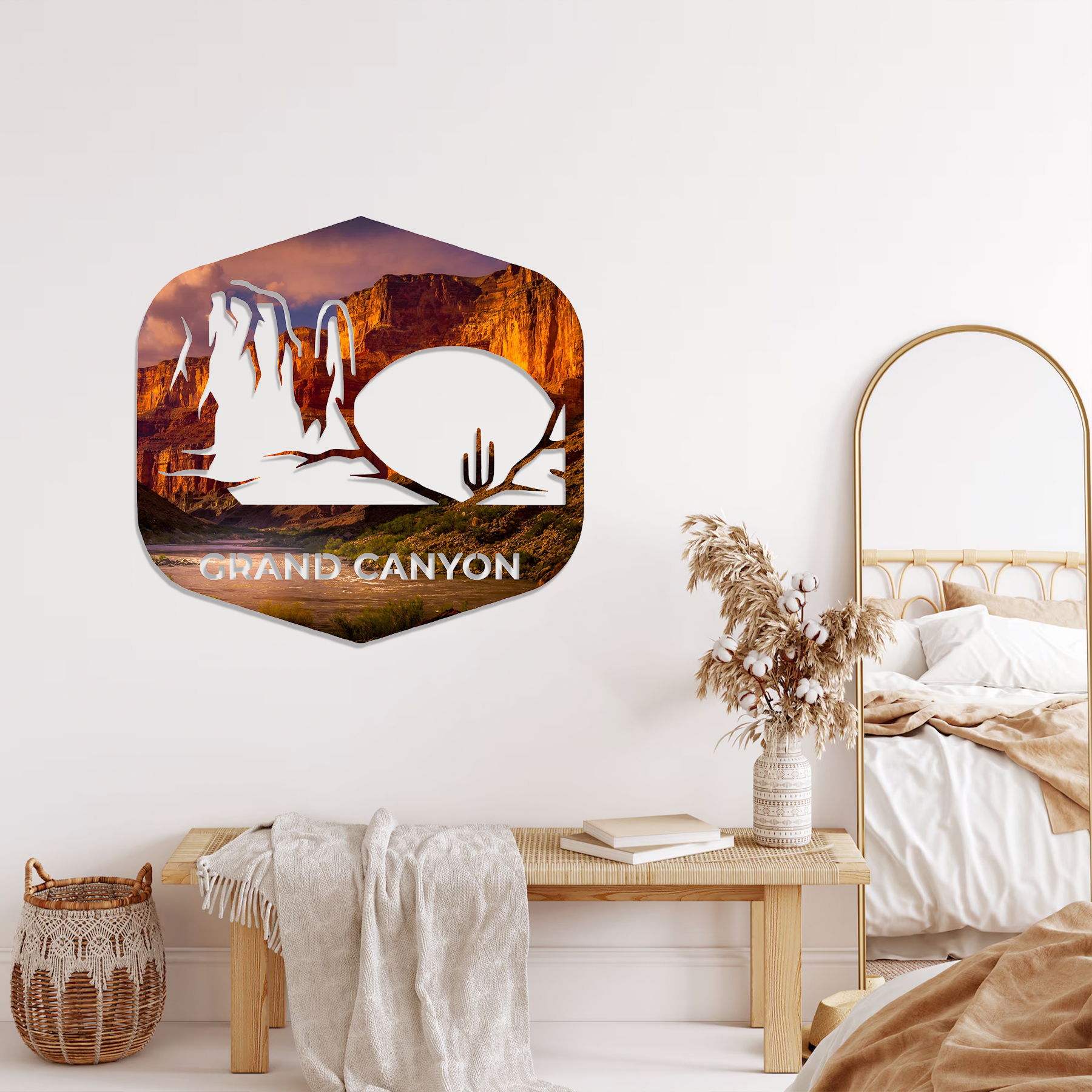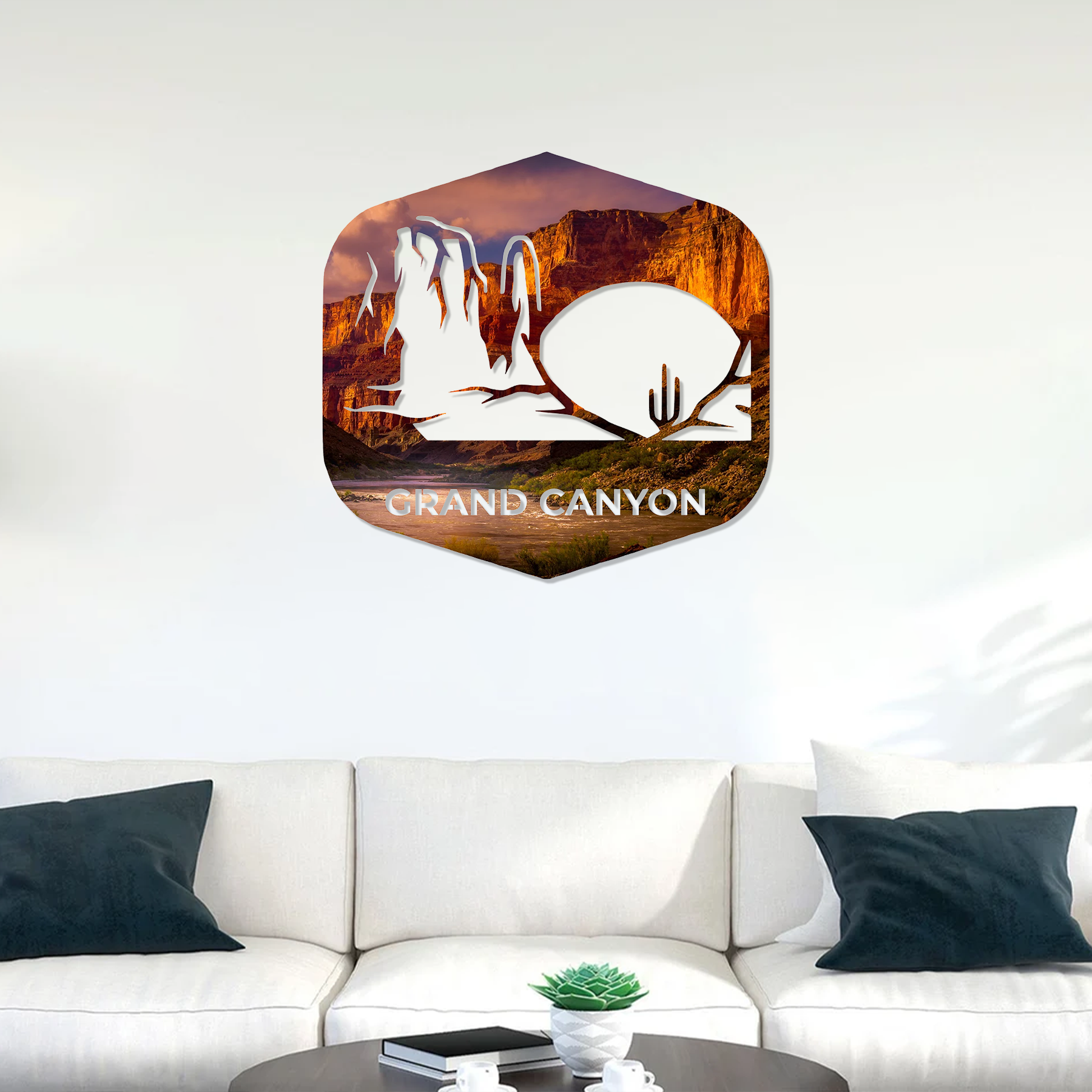 Featuring the rich, glowing hues of the Grand Canyon’s cliffs, paired with cut-out silhouettes of desert landscapes and cacti, this design captures the essence of one of the world’s most iconic natural wonders. Perfect for adventurers, travelers, and nature lovers, it brings the majesty of the Southwest into your home.