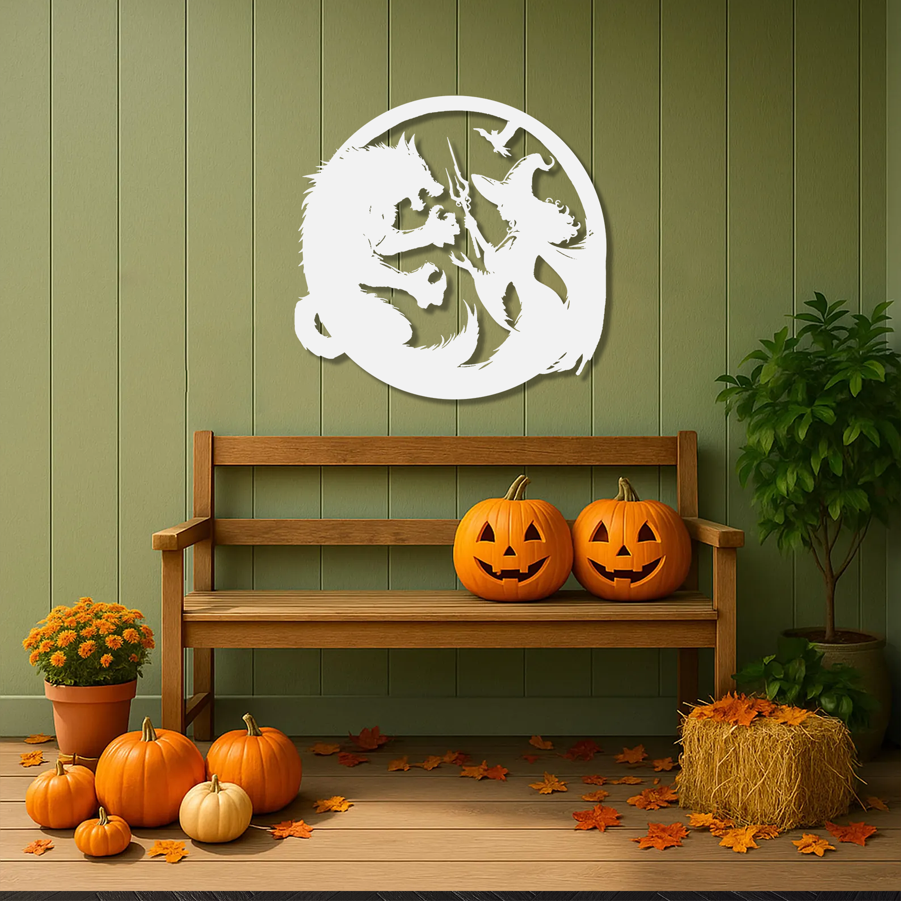 Step into a world of dark enchantment with the Wicked Battle Wall Art, a spellbinding piece from our Spooky Halloween Collection. This mesmerizing design captures a fierce duel between a witch and a werewolf beneath a haunting moon, perfectly blending power, mystery, and motion in one stunning silhouette.